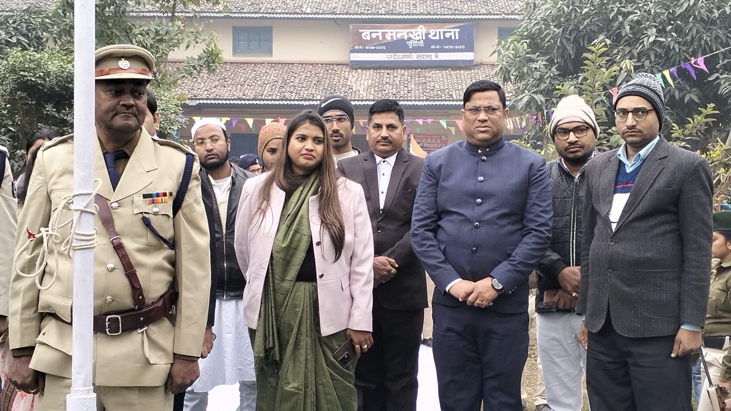प्रतिनिधि, बनमनखी(पूर्णियां):-बनमनखी अनुमंडल क्षेत्र में शांतिपूर्ण, सोहार्दपूर्ण वातावरण के बिच 75 वां गणतंत्र दिवस शुक्रवार को मनाया गया.इस अवसर पर विभिन्न सरकारी गैर सरकारी संस्थानों में झंडोत्तोलन कर झंडे को सलामी दी गई.सबसे पहले अनुमंडल पदाधिकारी के आवास पर अनुमंडल पदाधिकारी मो अहमद अली अंसारी ने झंडोत्तोलन किया. इसके बाद अनुमंडल पुलिस पदाधिकारी के आवास पर अनुमंडल पुलिस पदाधिकारी हुलास कुमार ने झंडोत्तोलन किया. इस अवसर पर स्वतंत्रता सेनानी बाबू वीर कुंवर सिंह, पंडित जवाहर लाल नेहरू, बाबा साहब भीम राव अंबेडकर के प्रतिमा पर अधिकारी व जनप्रतिनिधियों ने माल्यार्पण किया गया.