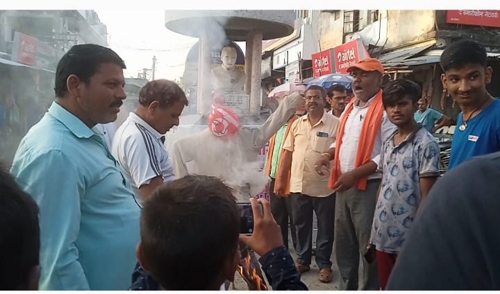 बनमनखी (पूर्णिया) विश्व हिंदू परिषद:  –  बजरंग दल के प्रखंड अध्यक्ष शिव शंकर तिवारी के नेतृत्व में बनमनखी अनुमंडल मुख्यालय के नेहरू चौक पर जिहादी आतंकियों का किया पुतला दहन  विदित है